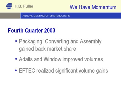WITH SOME POSITIVE SALES TRENDS, WE BEGAN TO GAIN MOMENTUM IN THE FOURTH QUARTER OF 2003. OUR PACKAGING, CONVERTING AND ASSEMBLY BUSINESSES GAINED BACK MARKET SHARE; ADALIS AND WINDOW IMPROVED VOLUMES, AND OUR EFTEC AUTOMOTIVE JOINT VENTURE REALIZED SIGNIFICANT VOLUME GAINS THROUGH NEW PRODUCT SALES.