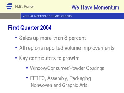KEY CONTRIBUTORS TO OUR GROWTH WERE OUR WINDOW, CONSUMER, AND POWDER COATING BUSINESSES WITHIN OUR FULL-VALU/SPECIALTY GROUP. WITHIN GLOBAL ADHESIVES, EFTEC ACHIEVED VOLUME IMPROVEMENTS; ASSEMBLY AND PACKAGING DEMONSTRATED GROWTH IN NORTH AMERICA AND ASIA PACIFIC; NONWOVEN MADE PROGRESS IN ASIA PACIFIC; AND GRAPHIC ARTS EXPERIENCED GAINS IN EUROPE. OUR SALES IN MARCH CONTINUED ON THIS VERY POSITIVE TREND-LINE.