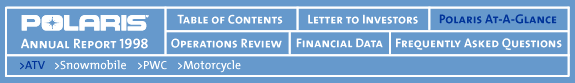 1998 OVERVIEW ATV sales grew 42 percent in 1998 to $674 million, making ATVs our largest product line representing 57 percent of total Polaris sales. We picked up market share in an expanding industry that had total worldwide retail sales of 520,000 units in 1998, up 19 percent from 1997. Orders for our Sportsman 500 Remington Special Edition greatly exceeded expectations and gave us added visibility in the southeastern United States where the Polaris brand is not as well known. HIGHLIGHTS OF THE YEAR:
