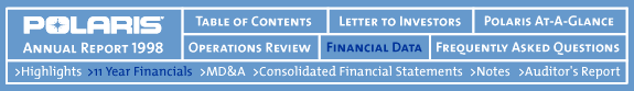 (1) In 1998, Polaris entered into a settlement agreement related to a trade secret infringement claim brought by Injection Research Specialists, Inc. The one-time provision for litigation loss of $61.4 million, or $1.53 per diluted share, has been excluded from the 1998 financial data presented.
