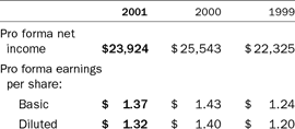Stock Option Plan Pro forma information regarding net income and earnings per share is required by SFAS No. 123, and has been determined as if the Company had accounted for its employee stock options under the fair value method of SFAS No. 123. The fair value for these options was estimated at the date of grant using a Black-Scholes option pricing model with the following weighted-average assumptions: risk-free interest rates of 4.5%; dividend yields of zero; volatility factors of the expected market price of the Companys common stock of .358 for fiscal 2001, .483 for fiscal 2000 and .507 for fiscal 1999; and a weighted-average expected life of the option of one to five years. |