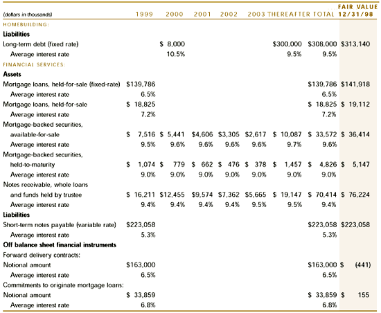 Interest rate risk is the primary market risk facing the Company. Interest rate risk arises principally in the Company's financial services segment but also with respect to the homebuilding segment long-term debt. The Company enters into forward delivery contracts and may at times use other hedging contracts to mitigate its exposure to movements in interest rates on mortgage loan commitments and mortgage loans held-for-sale based upon the Company's marketing strategy that establishes a risk tolerance level. The major factors influencing the use of hedging contracts include general market conditions, interest rates, types of mortgages originated, and the percentage of mortgage loan commitments expected to be funded. The market risk assumed while holding the hedging contracts mitigates the market risk associated with the mortgage loan commitments and mortgage loans held-for-sale. In managing interest rate risk, the Company does not speculate on the direction of interest rates. Although the collateral for bonds payable and the bonds payable of the limited-purpose subsidiaries are subject to interest rate risk, the Company has not guaranteed nor is otherwise obligated with respect to these bond issues and therefore has no risk of loss. Note: |