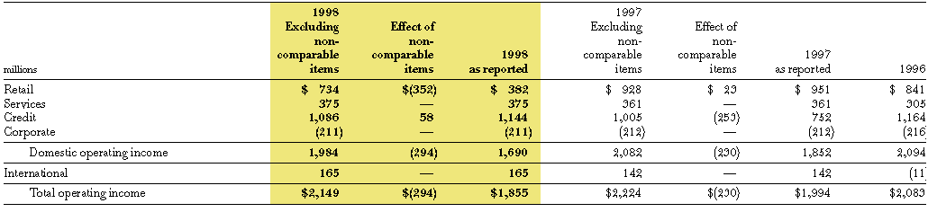 Description of Noncomparable Items On November 2, 1998, the Company completed an Agreement and Plan of Merger of Western Auto, a wholly-owned subsidiary, and Advance Auto Parts whereby Sears exchanged its interest in Western Auto for $175 million in cash and approximately 40% equity ownership interest in the resulting combined company. Based upon the terms of the sale, the Company recorded a pretax charge of $296 million ($225 million after-tax) in the third quarter of 1998 to adjust the carrying value of Western Auto's assets to their estimated fair market value, less cost to sell. In the fourth quarter, the loss was revised to reflect an additional after-tax charge of $18 million based on the final terms of the transaction. On October 2, 1998, the Company prepaid debt with a face value of $300 million, which was due in May 2000. The transaction generated an extraordinary loss of $37 million ($24 million after-tax). The loss resulted primarily from the write-off of the related unamortized discount. In 1997, the Company implemented Statement of Financial Accounting Standards ("SFAS") No. 125 which changed the way the Company accounts for securitizations. SFAS No. 125 accounting provided incremental net income of $36 million in 1998 and reduced reported credit revenues, selling and administrative expense and the provision for uncollectible accounts by $549 million, $129 million and $478 million, respectively. In 1997, SFAS No. 125 accounting provided incremental net income of $136 million and reduced reported credit revenues, selling and administrative expense and the provision for uncollectible accounts by $321 million, $126 million and $417 million, respectively. The 1997 reaffirmation charge of $475 million ($320 million after-tax) represents the estimated cost of the settlement of lawsuits and investigations by governmental agencies, including federal prosecutors, which alleged that the Company had violated the United States Bankruptcy Code and consumer protection laws in various states through activities related to certain debt reaffirmation agreements and other related matters. This estimate was based on management's assumptions as to the ultimate outcome of future events and uncertainties. While at year-end 1998 there are still additional costs to be incurred related to these matters, one of the most significant uncertainties was resolved on February 19, 1999, when the Company's plea agreement with the U.S. Attorney for the District of Massachusetts was approved by a federal district court. As part of the agreement, the Company agreed to pay a $60 million fine. In 1997, the Company sold to IBM its 30% equity interest in Advantis, a joint venture between IBM and the Company. The sale resulted in a pretax gain of $150 million ($91 million after-tax) recorded in other income. In 1997, the Company sold 60% of the outstanding shares of Sears Mexico to Grupo Carso S.A. de C.V. The sale was recorded in the first quarter of 1997 and resulted in a pretax loss of $21 million reflected in other income and tax expense of $15 million, for an after-tax loss of $36 million. The Company changed its postretirement life insurance benefit plan in 1997 by eliminating retiree life insurance benefits for all active associates not retired by December 31, 1997. This plan change resulted in a one-time pretax curtailment gain of $61 million ($37 million after-tax) recorded as a reduction of selling and administrative expense. The majority of the Western Auto stores were converted to the Parts America format in 1997 and, as a result, the Company recorded a pretax charge of $38 million ($23 million after-tax) for this initiative.