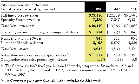 Retail Retail store revenues as reported, operating income excluding noncomparable items and related information are as follows: ![]() Retail revenues increased 1.1% in 1998 to $30.43 billion from $30.09 billion in 1997. Revenues in 1998 included 52 weeks compared to 53 weeks in 1997. Full-line Stores revenues increased 1.3% in 1998, benefiting from the net addition of 12 Full-line Stores as 23 stores were opened and 11 were closed. The Full-line Stores increase was led by solid revenue performance in hardlines merchandise as comparable store sales increased in 1998. Hardlines revenue increases in home appliances and electronics were partially offset by a decline in home improvement and home office merchandise sales. The hardlines revenue increase was partially offset by soft apparel sales. Apparel sales were strong in women's special sizes, fine jewelry and cosmetics and fragrances but weak in dresses, junior's, boy's and men's apparel. |