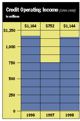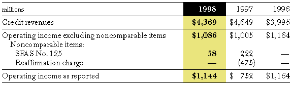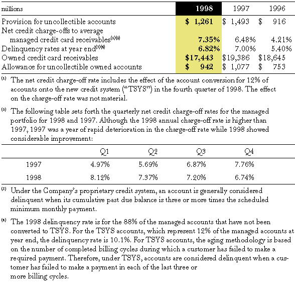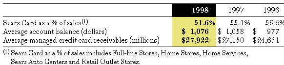 Credit ![]() The primary reason for the $392 million increase in 1998 reported operating income in the Credit segment compared to 1997 is the $475 million reaffirmation charge which adversely affected 1997 results. Other factors affecting reported Credit operating results are discussed below. In 1998, Credit revenues decreased 6.0% to $4.37 billion. The decrease in Credit revenues was attributable to a lower level of owned credit card receivables and the 53rd week included in the prior year. In 1997, Credit revenues increased 16.4% to $4.65 billion, reflecting higher average owned receivable balances, increased late fees and the benefit of the 53rd week of revenues. Excluding the effect from the change in accounting related to SFAS No. 125 in 1997, Credit revenues would have increased 24.4% over 1996 levels. A summary of Credit information for the managed portfolio is as follows: ![]() The percentage of merchandise sales and services transacted with the Sears Card in 1998 declined to 51.6% compared to 55.1% in 1997, due to a greater preference for other payment methods, including cash, check and third-party credit cards.