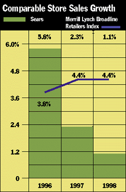 In addition to revenue growth in the Full-line Stores, Specialty Store revenues increased slightly to $7.29 billion in 1998 from $7.25 billion in 1997. The strong revenue performance in Hardware and Dealer Stores was offset by a decline in Auto Stores revenues. The revenue increase in Hardware and Dealer Stores in 1998 resulted from the addition of new stores and strong comparable store sales increases. During 1998, the Company opened 10 net new Hardware Stores and 77 net new Dealer Stores. The Commercial Sales business also produced strong revenue gains as the Company continued to expand this business. In 1998, HomeLife revenues decreased slightly and the HomeLife business ended 1998 with one less store than in 1997. The Auto Stores 1998 revenues declined from 1997 levels as comparable store sales decreased. Both Sears Auto Centers and NTB sales were adversely affected by the relatively mild winter weather experienced in 1998. Results were also affected by the sale of the Parts Group on November 2, 1998, which caused 1998 revenues to reflect only 10 months of Parts Group sales versus 12 months in the prior year. Throughout 1998, the Company worked to build name recognition for the new NTB format. As of year end, the Company operated 789 Sears Auto Centers and 347 NTB stores. Retail revenues increased 8.0% in 1997 to $30.09 billion from $27.86 billion in 1996. Revenues in 1997 included 53 weeks compared to 52 weeks in 1996. Full-line Stores revenues increased 5.8% in 1997 as the Company opened 21 and closed 9 Full-line Stores. The addition of the 53rd week in 1997 also contributed to the revenue growth. In 1997, apparel sales gains were led by increases in women's ready-to-wear, children's and men's fashions and footwear. Hardlines merchandise had a solid revenue increase in 1997 led by strong sales growth in home appliances and electronics merchandise, partially offset by a decline in home improvement merchandise sales. Specialty Store revenues increased to $7.25 billion in 1997 from $6.28 billion in 1996. The increase primarily resulted from a full year of sales from the Orchard Supply Hardware Stores in 1997, compared to 1996, which included only fourth quarter sales; and the 53rd week in 1997. Dealer Stores revenues increased as the Company added 107 net new stores in 1997. The HomeLife business closed 23 locations in 1997 to focus better on high concentration markets and cost management.