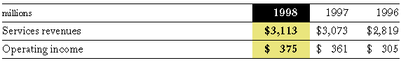 Services Services revenues, generated primarily by the Home Services business, increased 1.3% in 1998. Home Services revenues were flat due to a slight decline in the home improvement business and the 53rd week included in the prior year. The Company plans future growth in the Home Services business through market expansion, improved marketing effectiveness and strengthening of the Company's licensees. Sears Direct revenues increased 8.5% in 1998 from 1997 levels due to continued strength of its marketing programs in targeting customers at home for its various merchandise and services. All categories of Sears Direct products showed improved revenue results, including clubs and services, insurance and specialty catalogs. In 1997, Services revenues improved 9.0% primarily due to increased Home Services revenues, led by increases in in-home repair services and growth in home improvement services. Revenues in 1997 also included the effect of the 53rd week. Sears Direct revenues increased substantially in 1997 from 1996 levels due to continued strength of its insurance programs. Services gross margin as a percentage of Services revenues increased 100 basis points in 1998 from 1997. The margin rate increased due to the continued effort to improve the profitability of the service contracts portfolio within the Home Services business. In 1997, Services gross margin as a percentage of revenues improved 370 basis points from 1996, primarily due to improved profitability of the service contracts portfolio. Services selling and administrative expense as a percentage of Services revenues increased 50 basis points in 1998 from 1997. The increase was due to increased infrastructure investments in the businesses to support planned growth. In 1997, Services selling and administrative expense as a percentage of Services revenues increased 240 basis points from 1996 due to increased marketing costs. Services depreciation and amortization expense increased 14.1% in 1998 from 1997 and 11.8% in 1997 compared to 1996. These increases reflect both the internal growth of the business and growth through acquisition. Overall, Services operating income as a percentage of Services revenue was relatively flat in 1998 compared to 1997. A slight increase in the Home Services operating margin was offset by a decline in the Sears Direct operating margin. Even with a decline in operating margin in 1998, the Sears Direct business continued to provide a significant portion of the operating income for the Services segment.