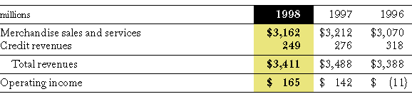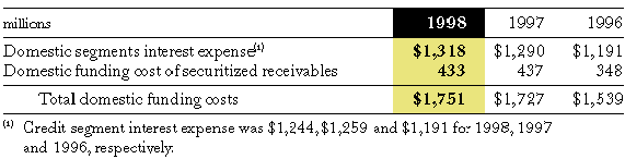 Interest expense from the domestic segments is included in the Credit segment discussion since the majority of the Company's domestic interest expense is allocated to the Credit segment. Generally, the domestic interest expense that is not allocated to the Credit segment is allocated to the Retail segment and is not a significant cost relative to costs of sales, buying and occupancy, selling and administrative expense and depreciation and amortization expense in the Retail segment. Domestic interest expense is combined with the funding cost on receivables sold through securitizations to represent total funding costs. The Company uses credit card receivable securitizations as a significant funding source and therefore, for purposes of this analysis, the interest paid on securitizations is considered a funding cost. The total domestic funding costs are as follows: ![]() Total domestic funding costs increased 1.4% in 1998 to $1.75 billion. The increase in funding costs reflects additional debt needed to support a larger managed credit card receivable portfolio, higher inventory levels, capital spending and share repurchases, partially offset by a lower funding rate environment. While the managed credit card receivables and inventory levels were higher on average throughout 1998 than in 1997, the managed credit card receivable balances and inventory balances at the end of 1998 were actually lower than at the end of 1997, as noted in management's analysis of consolidated financial condition. In 1997, the increase in funding costs reflects higher funding requirements due to a larger managed credit card receivable portfolio and the redemption of the Preferred Shares in the fourth quarter of 1996, partially offset by lower effective funding rates resulting from the refinancing of higher rate debt.