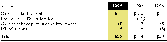 International gross margin as a percentage of International merchandise sales and services decreased 30 basis points in 1998 from 1997. Sears Canada gross margin rate declined primarily due to increased buying costs. In 1997, International gross margin as a percentage of International merchandise sales and services increased 200 basis points from 1996. Sears Canada gross margin rate improved substantially due to savings realized from merchandise sourcing initiatives. International selling and administrative expense as a percentage of total International revenues improved 100 basis points in 1998 from 1997. Sears Canada selling and administrative expense rate improvement was primarily due to leveraging payroll and other employee related costs. In 1997, International selling and administrative expense as a percentage of total International revenues improved 110 basis points from 1996. Sears Canada selling and administrative rate improvement was primarily due to cost containment initiatives coupled with revenue growth and a favorable comparison to 1996, which included a restructuring charge. International operating income improved $23 million in 1998 compared to 1997. The improvement is due to revenue growth resulting from the aggressive growth strategy in the furniture and dealer store networks and renovations of full-line stores; as well as strong expense leverage and less interest expense, partially offset by a lower exchange rate. Operating income improved $153 million in 1997 compared to 1996 as Sears Canada benefited from the improving economic environment in 1997, as well as the favorable response to the remodeling of its full-line stores and expansion of its furniture and dealer networks. OTHER INCOME ![]()