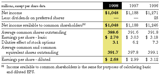 ![]() In each period, certain options were excluded from the computation of diluted earnings per share because they would have been antidilutive. At January 2, 1999, January 3, 1998 and December 28, 1996, options to purchase 5.2, 4.7 and 0.7 million shares of stock at prices ranging from $52 to $64, $47 to $64 and $48 to $52 per share were excluded from the 1998, 1997 and 1996 calculations, respectively. 13. SHAREHOLDERS' EQUITY