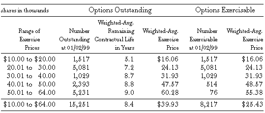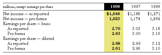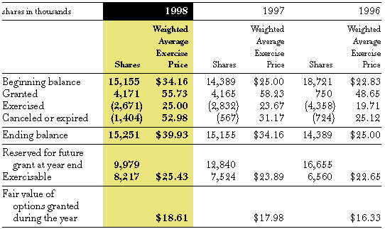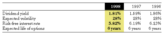 Stock Option Plans Additionally, certain options were granted in 1997 with performance-based features that required the Company's share price to reach specified targets at three- and five-year intervals from the grant date to be earned. In February 1999, the Company extended the period of time allowed to meet the specified targets by one year. The Company had 1.2 million and 1.4 million performance-based options outstanding at the end of 1998 and 1997, respectively. Subject to the satisfaction of the performance-based features, these performance-based options vest 50% in year six, 25% in year seven and 25% in year eight from the time of grant. The Company did not recognize compensation expense in 1998 or 1997 related to these options because the exercise price exceeded the Company share price at both year ends. The Company measures compensation cost under Accounting Principles Board Opinion No. 25, "Accounting for Stock Issued to Employees," and no compensation cost has been recognized for its fixed stock option plans. In accordance with SFAS No. 123, "Accounting for Stock-Based Compensation," the fair value of each option grant is estimated on the date of grant using the Black-Scholes option-pricing model. The following assumptions were used during the respective years to estimate the fair value of options granted: