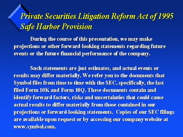 We believe that Symbol offers an outstanding shareholder value proposition based on its ability to offer highly integrated and multi-functional mobile devices for computing and data capture, with a focus on vertical (industrial) enterprise markets.