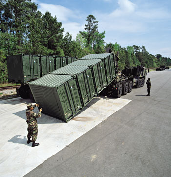 builds similar containers called "Tricons" for the U.S. Marine Corps, where three units nest into a 20ft module. Other specialized types are manufactured for all the branches of the U.S. military. In addition, the company assembles over-the-road chassis for sale and lease. |
