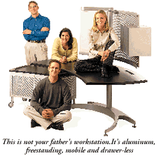 TBWA/Chiat/Day thinks so, and they're an international advertising agency with a long list of illustrious campaigns to their credit (for example, the Energizer Bunny and Apple Computer's "Think Different" ads). Clive Wilkinson, the architect of TBWA/Chiat/Day's new Los Angeles office, conceived a freestanding aluminum workstation for the space, then worked with Steelcase's Turnstone designers to engineer and manufacture it. Called NEST (for New Environment for Strategic Tasking), it features a mobile storage unit instead of drawers (for more leg room) whose top can double as a worksurface if necessary; a metal privacy screen with a section for magnetic attachments and a tackboard for paperwork; and an integrated overhead light. Now, thanks to NEST, when the agency's people want to get together and brainstorm, they don't have to leave their workstations behind.