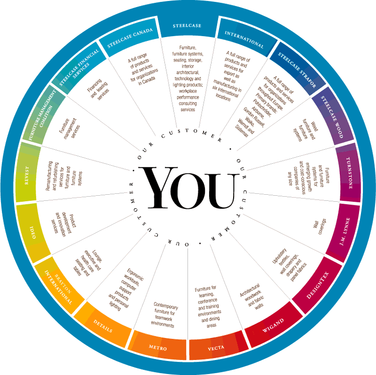 How does this look to a customer? Imagine that you are one of the companies we serve around the world, like Federal Express Corporation or Lucent Technologies. Here's how the world of Steelcase would look to you . . .