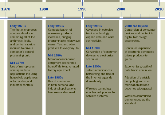 Since the late 1960s, advances in electronic technology have led to the manufacture of a wide array of products, ranging from the microwave oven to complex satellite systems. Arrow´s suppliers have developed the key devices that drive technology, and Arrow´s customers have used that technology to create the products that are now an integral part of our daily lives. Since the first microprocessor was launched in the early 1970s to the mid-1980s, when electronics manufacturing became the largest manufacturing industry in the United States, electronic technology has replaced much of what was once manual or mechanical. Electronic controls for industrial machines have led to dramatic improvements in productivity and quality. Medical imaging systems facilitate the early detection of diseases. Advances in telecommunications have connected people to information and to each other across the globe.
