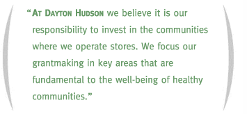 Whether it's helping kids in crisis, supporting fine arts programs, or getting children ready to go back to school, Dayton Hudson funding and volunteers are there to help. In 1999, our grantmaking will exceed $67 million, helping fund thousands of nonprofit organizations that serve our communities across the nation.