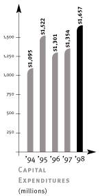 Capital expenditures were $1,657 million in 1998, compared with $1,354 million in 1997. Investment in Target accounted for 82 percent of 1998 capital expenditures, with 10 percent at Mervyn's and 8 percent at DSD. Net property and equipment increased $844 million, reflecting capital invested offset by depreciation. During 1998, Target opened 55 net new stores, Mervyn's closed one store and DSD closed two stores. Approximately 63 percent of total expenditures was for new stores, expansions and remodels. Other capital investments were for information systems, distribution and other infrastructure to support store growth. Over the past five years, Target's retail square footage has grown at a compound annual rate of approximately 10 percent. We expect Target to continue to expand in the range of 7 to 9 percent annually for the foreseeable future.