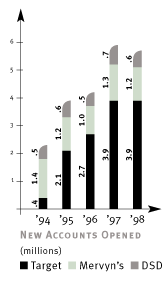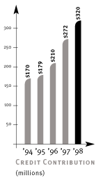 In 1998, pre-tax contribution from credit increased 18 percent over the prior year, compared to the 6 percent growth in average receivables serviced. The improved credit performance reflects continued growth of the Target Guest Card, along with strong revenue increases associated with changes in credit terms and expansion of our guest loyalty programs at all three divisions.