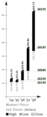 Our primary objective is to maximize shareholder value over time through a combination of share price appreciation and dividend income while maintaining a prudent and flexible capital structure. Our total return to shareholders was 79 percent in fiscal 1998 and 45 percent and 27 percent per year over the last five and ten years, respectively.