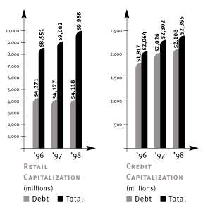 Reflecting our strong cash flow, we ended 1998 with a retail debt ratio of 41 percent. In evaluating our debt level, we separate retail operations from credit operations due to their inherently different financial characteristics. We view the appropriate capitalization of our credit business to be 88 percent debt and 12 percent equity, similar to ratios of comparable credit card businesses.