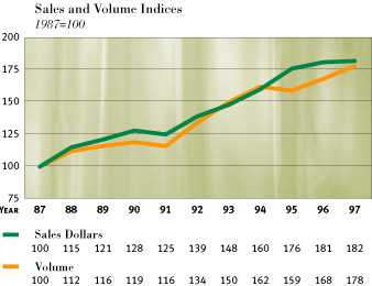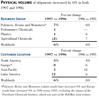 Net sales of $3,999 million were essentially the same as in 1996, the net result of 6% volume gains, one percent lower selling prices, 9% weaker currencies in Europe, a 10% weaker Japanese yen and the absence of Petroleum Chemicals sales which were part of the RohMax joint venture in 1997. Volume growth was strong in all regions, with all businesses contributing except Agricultural Chemicals. Sales in 1996 of $3,982 million were 3% higher than 1995 due to 6% volume gains, offset by 1% lower selling prices and a 15% weaker Japanese yen. Volume grew due to strengthening economies around the world and the resurgence of the construction and automotive markets. All regions and most businesses contributed to the 1996 volume growth.