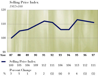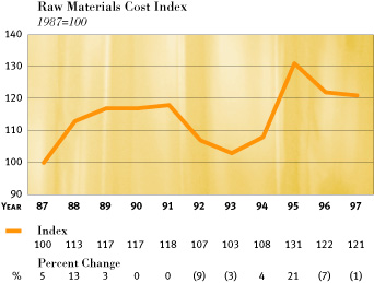 Raw material prices remained stable in 1997. They declined throughout the first three quarters of 1996, until natural gas and oil prices increased in the fourth quarter of that year. Prices for raw materials, including styrene, propylene, acetone and butanol, were down 1%, net, in 1997 compared to decreases of 7% in 1996 and increases of 18% in 1995, excluding currency impacts. The 1995 increases were caused by tightness of petrochemical supply which eased during 1996. The charts below and on page 26 identify year-to-year changes for average unit raw material costs and average unit selling prices based on the company's product mix.