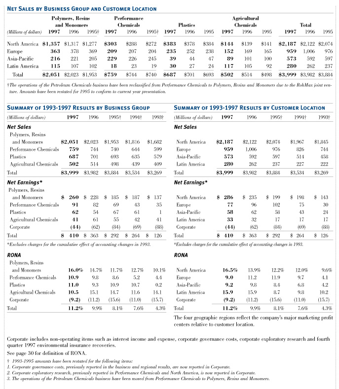 Performance Chemicals reported 1997 earnings of $91 million, up 11% from 1996 earnings of $82 million. Sales increased 2% on volume growth of 4%. Because of weaker currencies in Europe and in the Asia-Pacific regions, the volume increase did not result in comparable sales growth. Increased earnings are a result of double-digit volume growth in Electronic Chemicals, which includes a contribution from Rodel, Inc. a 1997 investment. Also contributing was volume growth and operating improvements in Ion Exchange Resins. The discontinuation of the Biocides joint venture with Dead Sea Bromine reduced sales and earnings.