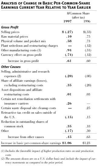 Gross profit increased to $1,455 million in 1997, up 4% from 1996. The gross profit margin was 36%, 35% and 34% in 1997, 1996 and 1995, respectively. The gross profit margin increased in 1997 because of higher volume but was negatively affected by one percent lower selling prices and unfavorable currency impacts. Total gross profit increased in 1996 to $1,395 million, up 5% from 1995. The gross profit margin increased in 1996 because of declining raw material prices and higher volume. One percent lower selling prices, a plant writedown in the U.S. and restructuring costs in Japan hurt margins in 1996.