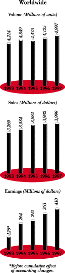 There also have been changes in our Board of Directors. In 1997, Jorge Montoya of Procter & Gamble spent his first full year on the board. William Avery of Crown, Cork & Seal joined us in December 1997. In 1998, two long-time directors will reach retirement age and will not stand for re-election in May. George "Spike" Beitzel, who came to us from IBM, has given us wise counsel, both on the board and as a member of our Environmental Advisory Council for more than a decade. Paul Miller has earned the distinction of having the longest service of any outside board member - 29 years. Throughout his tenure, Paul has been an unabashed champion of the shareholder. We thank both men for sharing their wisdom and time with us. Fred Shaffer, Chief Financial Officer, retired in August after 37 years of service. It is said that, "If a man has any greatness in him, it comes to light - not in one flamboyant hour, but in the ledger of his daily work." Fred's contribution to Rohm and Haas was significant, and we thank him for it. We also welcome Brad Bell, our new Chief Financial Officer. |
