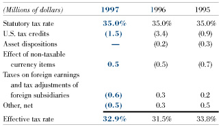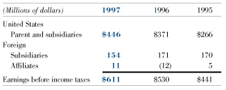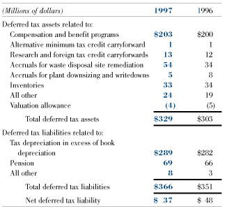 following: ![]() At December 31, 1997, the company had no research tax credit carryforwards. Foreign tax credit carryforwards of $13 million are available to reduce future U.S. income tax payments through 2002 and alternative minimum tax credit carryforwards of $1 million are available to reduce future U.S. regular income tax payments over an indefinite period. In addition, the company has net operating loss carryforwards of $3 million to offset future foreign taxable income through 2002. Provision for U.S. income taxes, after applying statutory tax credits, was made on the unremitted earnings of foreign subsidiaries and affiliates which have not been reinvested abroad indefinitely. Unremitted earnings, after provision for applicable foreign income taxes, were approximately $366 million at December 31, 1997. If the foreign subsidiary and affiliate earnings were remitted as dividends, the amount of additional U.S. income taxes, after applying statutory tax adjustments, would not be material. |