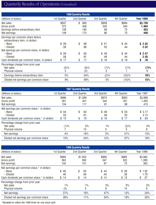 Earnings for the third quarter of 1998 decreased 5% to $86 million from $91 million in the third quarter of 1997. Diluted earnings per common share for the quarter were $.48 unchanged from the 1997 quarter. Included in the 1998 results is an extraordinary after-tax charge of $3 million, or $.02 per share, related to an early extinguishment of debt. Volume increased 3% for the quarter and sales decreased 7%. On a comparable-business basis, volume increased 1% and sales decreased 3%, primarily