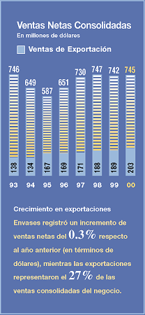 En el 2000 el flujo de operación sumó $169 millones de dólares, una baja del 15% en pesos constantes y del 8% en dólares. Las iniciativas de reducción en costos y gastos del negocio, fueron parcialmente afectadas por los altos incrementos en los precios del gas natural y en los materiales de empaque. A pesar de estos incrementos, se lograron ahorros en costos por encima de los $20 millones de dólares, y permanentemente se exploran oportunidades para continuar con estos ahorros. Las exportaciones en comparación con 1999 crecieron 8% hasta alcanzar $203 millones de dólares. Los segmentos de alimentos y bebidas, al igual que las ventas en cosméticos, fueron factores clave del crecimiento en exportaciones. Sumario En el 2000, Envases concluyó con éxito la reorganización de su estructura acorde a las necesidades de los segmentos de mercado que atiende, concentrándose en cuatro áreas: alimentos y bebidas (incluyendo refrescos, jugos y cerveza), vinos y licores, cosméticos y farmacéuticos, y exportaciones. Esta segmentación permitirá al negocio entender y detectar mejor las necesidades de los clientes, a la vez que apoyar las estrategias de largo plazo de los negocios, diversificar riesgos y maximizar la rentabilidad. Como se ha venido dando en todo el mundo, los materiales sustitutos han restado mercado al envase de vidrio. Esto ha orillado a reorientar la estrategia para enfocar los esfuerzos hacia los mercados de productos de valor agregado, tanto nacionales como internacionales. El negocio capitalizará su conocimiento y la tecnología adquirida y desarrollada durante muchos años de atender al mercado mexicano, el cual demanda volúmenes más bajos y mayor flexibilidad; a lo que es preciso agregar la incorporación de las nuevas tecnologías de decorado. Envases está enfocándose a entender, anticipar y servir mejor a las siempre cambiantes necesidades de los clientes, haciendo el mejor uso de sus habilidades para innovar y desarrollar nuevos productos de valor agregado, obteniendo progresos en las tecnologías de información y mejorando la administración de la cadena de abastecimientos. La empresa posee capacidad de producir botellas ligeras distintivas, botellas para mercados especiales y envases imágenes y diseños individualizados, de diversos colores y con formas y diseños sofisticados; así como etiquetas plastificadas, cerámicas y aplicadas mediante transferencia térmica. Para asegurar una mejor capacidad de respuesta en el desarrollo de nuevos productos, se ha reducido de doce a un promedio de cinco semanas el ciclo de este proceso. La desaceleración económica que padece Centroamérica está provocando un impacto negativo en los resultados de la coinversión en esa región. Aun y cuando los beneficios de un mejor control de costos no compensó totalmente las pérdidas, se podrán aprovechar las mejoras logradas en productividad por Comegua, cuando se materialice la esperada recuperación del mercado. |