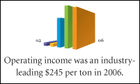 converts scrap to liquid steel to achieve significant savings in labor, raw material and energy costs. Our lean manufacturing and Six Sigma initiatives also continue to bear fruit, as evidenced by a continuous reduction in man-hours per ton of plate and coil produced over the past five years. However, IPSCO's most important competitive advantage may be its unique operating structure. As a fully integrated steel and pipe company, we are invested along a single value chain from raw materials to steel manufacturing and processing. This gives us the opportunity to optimize production, control quality and enhance margins at every stage of our operations.