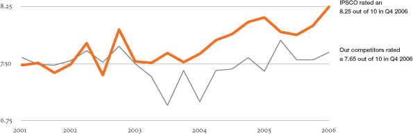 IPSCO's migration toward higher value-added products and services goes hand in hand with our efforts to build stronger customer relationships. During the past year, we have continued to increase direct sales and build a stronger brand presence in the market by working more collaboratively with original equipment manufacturers (OEMs), as well as service centers and distributors. Former NS Group operations are similarly focused. The advanced performance properties of Ultra'sTM patented connections have earned a high degree of customer loyalty and our small diameter seamless pipe has achieved a leading market share in the energy tubular market. Strong customer relationships are also very much in evidence in our plate and coil businesses. In 2006, IPSCO achieved the industry's #1 ranking in overall satisfaction, quality, service and on-time delivery in an independent survey of our plate customers.