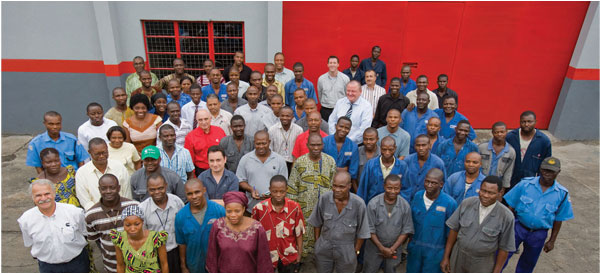 Cummins West Africa employees gather outside their facilities in Lagos, Nigeria. The distributorship, which is also the site of a new manufacturing operation for power generator sets, is a joint venture between Cummins and A. G. Leventis.