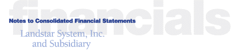 (1) Significant Accounting Policies Consolidation The consolidated financial statements include the accounts of Landstar System, Inc. and its subsidiary Landstar System Holdings, Inc. (“LSHI”). Landstar System, Inc. and its subsidiary are herein referred to as “Landstar” or the “Company.” Significant inter-company accounts have been eliminated in consolidation. The preparation of the consolidated financial statements requires the use of management’s estimates. Actual results could differ from those estimates. Fiscal Year Landstar’s fiscal year is the 52 or 53 week period ending the last Saturday in December. Revenue Recognition Revenue and the related direct freight expenses are recognized upon completion of freight delivery. Insurance Claim Costs Landstar provides, on an actuarially determined basis, for the estimated costs of cargo, property, casualty, general liability and workers’ compensation claims both reported and for claims incurred but not reported. Landstar retains liability up to $1,000,000 for each individual property, casualty and general liability claim, $250,000 for each workers’ compensation claim and $100,000 for each cargo claim. Tires Tires purchased as part of trailers are capitalized as part of the cost of the equipment. Replacement tires are charged to expense when placed in service. Investments Investments, all of which are intended to be held to maturity, consist of investment grade bonds having maturities of up to three years and are carried at amortized cost, which approximates fair value. Short-term investments represent the current portion of these bonds. There are $3,877,000 and $4,002,000 of these bonds included in other assets at December 30, 2000 and December 25, 1999, respectively. Operating Property Operating property is recorded at cost. Depreciation is provided on a straight-line basis over the estimated useful lives of the related assets. Trailers are being depreciated over 7 years. Goodwill Goodwill represents the excess of purchase cost over the estimated fair value of net assets acquired. It is being amortized on a straight-line basis over periods of twenty and forty years. The Company assesses the recoverability of goodwill by determining whether the amortization of the goodwill balance over its remaining useful life can be recovered through projected undiscounted future operating cash flows. The amount of goodwill impairment, if any, is measured based on projected discounted future operating cash flows using a discount rate reflecting the Company’s current average cost of funds. Income Taxes Income tax expense is equal to the current year’s liability for income taxes and a provision for deferred income taxes. Deferred tax assets and liabilities are recorded for the future tax effects attributable to temporary differences between the financial statement carrying amounts of existing assets and liabilities and their respective tax bases. Deferred tax assets and liabilities are measured using the enacted tax rates expected to be applied to taxable income in the years in which those temporary differences are expected to be recovered or settled. Stock-based Compensation Compensation cost for the Company’s stock options is measured as the excess, if any, of the quoted market price of the Company’s stock at the date of grant over the exercise price of the stock option. Earnings Per Share Earnings per common share amounts are based on the weighted average number of common shares outstanding and diluted earnings per share amounts are based on the weighted average number of common shares outstanding plus the incremental shares that would have been outstanding upon the assumed exercise of all dilutive stock options. (2) Non-recurring Costs Approximately 100 Landstar Ranger, Inc. (“Landstar Ranger”) drivers are represented by the International Brotherhood of Teamsters (the “Teamsters”). The vast majority of these unionized drivers participate in the Teamsters’ Central States Southeast and Southwest Areas Pension Fund (the “Fund”). Under a prior collective bargaining agreement, Landstar Ranger was required to make contributions to various Teamster pension funds for 205 drivers regardless of the actual number of unionized drivers. Effective April 1, 2000, a new collective bargaining agreement required Landstar Ranger to make pension contributions for only the actual number of unionized drivers. As a result of the elimination of the requirement to make contributions for more than the actual number of unionized drivers, the Trustees of the Fund have terminated participation in the Fund by Landstar Ranger effective October 1, 2000. The Trustees of the Fund regard this action as a withdrawal by Landstar Ranger. In the third quarter of 2000, the Company recorded a charge in the amount of $2,230,000 for its estimated cost of withdrawal from the Fund. After deducting related income tax benefits of $880,000, this charge reduced fiscal year 2000 net income by $1,350,000, or $0.15 per common share ($0.15 per diluted share). On March 28, 2000, the Company announced a plan to restructure the operations of Landstar Ligon, Inc. and to relocate its headquarters from Madisonville, Kentucky to Jacksonville, Florida in June of 2000. As a result of this restructuring and relocation, a one-time charge in the amount of $3,040,000 was recorded during the second quarter of 2000 representing approximately $1,370,000 of employee and office relocation costs, $1,000,000 of severance costs and $670,000 of other costs. The restructuring and relocation were substantially completed by September 23, 2000. After deducting related income tax benefits of $1,225,000, this one-time restructuring charge reduced fiscal year 2000 net income by $1,815,000, or $0.21 per common share ($0.20 per diluted share). (3) Discontinued Operations On August 22, 1998, Landstar Poole, Inc. (“Landstar Poole”), a wholly-owned subsidiary of Landstar which comprised the en
