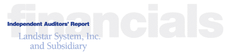 ![]() The Board of Directors and Shareholders Landstar System, Inc.: We have audited the accompanying consolidated balance sheets of Landstar System, Inc. and subsidiary as of December 30, 2000 and December 25, 1999, and the related consolidated statements of income, changes in shareholders’ equity and cash flows for the fiscal years ended December 30, 2000, December 25, 1999 and December 26, 1998. These consolidated financial statements are the responsibility of the Company’s management. Our responsibility is to express an opinion on these consolidated financial statements based on our audits. We conducted our audits in accordance with auditing standards generally accepted in the United States of America. Those standards require that we plan and perform the audit to obtain reasonable assurance about whether the financial statements are free of material misstatement. An audit includes examining, on a test basis, evidence supporting the amounts and disclosures in the financial statements. An audit also includes assessing the accounting principles used and significant estimates made by management, as well as evaluating the overall financial statement presentation. We believe that our audits provide a reasonable basis for our opinion. In our opinion, the consolidated financial statements referred to above present fairly, in all material respects, the financial position of Landstar System, Inc. and subsidiary as of December 30, 2000 and December 25, 1999, and the results of their operations and their cash flows for the fiscal years ended December 30, 2000, December 25, 1999 and December 26, 1998 in conformity with accounting principles generally accepted in the United States of America. ![]() Stamford, Connecticut February 6, 2001 |