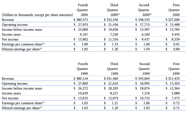 ![]() ![]() (1) Includes a pre-tax charge for the withdrawal from a union-sponsored pension plan of $2,230 in the third quarter and pre-tax restructuring costs of $3,040 in the second quarter. After deducting related income tax benefits of $880 and $1,225 in the third and second quarters, respectively, the pension plan withdrawal costs reduced net income by $1,350, or $0.16 per common share ($0.15 per diluted share), in the 2000 third quarter and the restructuring costs reduced net income by $1,815, or $0.20 per common share ($0.20 per diluted share), in the 2000 second quarter. (2) Due to the changes in the number of average common shares and common stock equivalents outstanding during the year, earnings per share amounts for each quarter do not necessarily add to the earnings per share amounts for the full year. |