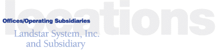 Corporate Headquarters Landstar System, Inc. 13410 Sutton Park Drive, South Jacksonville, FL 32224 P.O. Box 19135 Jacksonville, FL 32245 Phone: (800) 872-9400 (904) 398-9400 www.landstar.com Automotive Marketing Office 42000 West Six Mile Road Suite 100 Northville, MI 48167 Phone: (800) 305-0978 Government Transportation Services Office 6225 Brandon Avenue Suite 320 Springfield, VA 22150 Phone: (800) 443-6808 (703) 912-6808 |