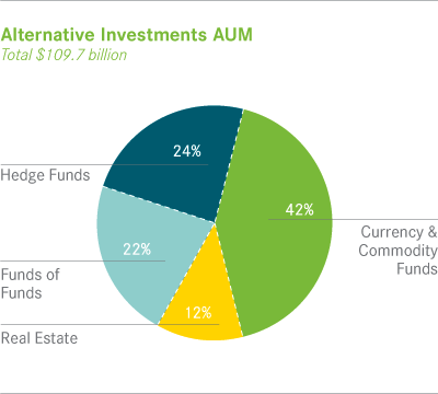 - Hedge funds ended the year with $25.9 billion of AUM in a variety of single-strategy, multi-strategy and global macro hedge funds, as well as portable alpha, distressed and opportunistic offerings. Products include both open-end hedge funds and similar products and closed-end funds that have been created to take advantage of specific opportunities over a defined, often longer-term investment horizon. Growth of $1.1 billion primarily came from $0.6 billion of net inflows into fixed income and multi-strategy hedge funds and strong investment and market performance of $1.8 billion across all strategies.