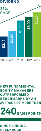 Superior investment performance has been a significant area of attention for BlackRock. Following the financial crisis, we reassessed and restructured much of our active fixed income business. This effort and our focus on helping our clients assess risk in their fixed income portfolios paid off amid the turmoil affecting those markets in 2013, when 82% of our taxable fixed income assets outperformed their benchmarks or peer medians over the three-year period. Our ability to outperform across our fixed income platform at a time when others have struggled earned BlackRock the #1 industry ranking in U.S. Retail Active Fixed Income flows. We believe our track record will provide a meaningful competitive advantage in 2014.