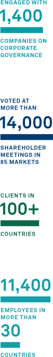 BlackRock's ownership position in companies across geographies and industries positions us to advocate for corporate change on behalf of our clients. We believe that a sound corporate governance framework promotes strong leadership by boards of directors and prudent management practices, contributes to the long-term success of companies and leads to better risk-adjusted returns for investors. To that end, in 2013 we engaged with approximately 1,400 companies on corporate governance, including on social, environmental and ethical issues, and voted at more than 14,000 shareholder meetings in 85 markets to protect and enhance the value of our investments. We believe that direct engagement with management, rather than headline-grabbing public pronouncements, are the most effective way to drive change. We will continue to challenge the management of the companies in which we invest to engage with us directly on governance issues.