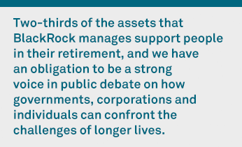 Two-thirds of the assets that BlackRock manages support people in their retirement, and we have an obligation to be a strong voice in public debate on how governments, corporations and individuals can confront the challenges of longer lives. I believe that bold policy ideas must be considered, such as the compulsory retirement savings model used in Australia's superannuation system. Pension funds also should consider a broader range of investments, including alternatives and nontraditional fixed income, to achieve the returns they need to meet their liabilities.