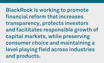 In the face of significant changes in the regulatory environment, BlackRock is working to promote financial reform that increases transparency, protects investors and facilitates responsible growth of capital markets, while preserving consumer choice and maintaining a level playing field across industries and products. We have been active participants in the public debate on issues ranging from money market reform and ETF regulation to housing finance, market structure and liquidity.