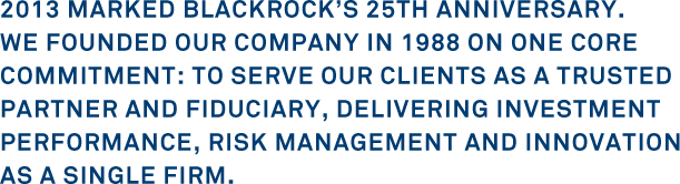 Much has changed over the first 25 years of BlackRock's existence. Our clients changed, our competitors changed, the landscape changed. All we can predict for certain is that change will accelerate in the years to come. So as we embark on the next 25 years, we will continue to evolve and align our offerings with investment trends and market opportunities to meet the needs and expectations of our clients.
