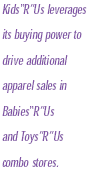 In 2003, Kids"R"Us will continue its efforts to drive more sales through trend-right merchandise that is competitively priced across all three divisions - Toys"R"Us combo stores, Babies"R"Us and Kids"R"Us. At the beginning of 2003, Kids"R"Us management