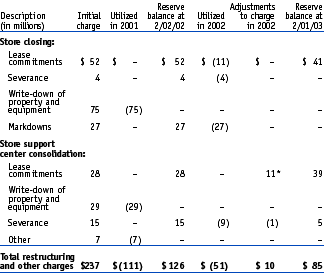 *In the fourth quarter of 2002, we determined that the reserve for lease costs for the disposition of one of our store support center facilities needed to be increased and, accordingly, recorded an additional charge of $11 million.