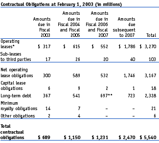 At February 1, 2003, we had available over $1 billion of cash and cash equivalents. Our current portion of long-term debt of $379 million at February 1, 2003 includes a 475 million Swiss Franc note, due on January 28, 2004. In addition, our long-term debt at February 1, 2003 includes a 500 million Euro bond, due on February 13, 2004. See the section "Other Matters" and the note to our consolidated financial statements entitled "SUBSEQUENT EVENTS" for a discussion regarding the registration of $800 million of debt securities in March 2003 and the sale and issuance of $400 million of notes in April 2003. We have $985 million in unsecured committed revolving credit facilities from a syndicate of financial institutions. These credit facilities are available for seasonal borrowings. There were no outstanding balances under these credit facilities at the end of fiscal 2002, 2001 or 2000. Additionally, we have lines of credit with various banks to meet certain of the short-term financing needs of our foreign subsidiaries. The following table shows our commercial commitments with their related expirations and availability: |