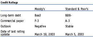Our debt instruments do not contain provisions requiring acceleration of payment upon a debt rating downgrade. We continue to be confident in our ability to refinance maturing debt. Other credit ratings for our debt are available; however we disclosed above only ratings of the two largest nationally recognized statistical rating organizations because we believe these are the most relevant to our business.
